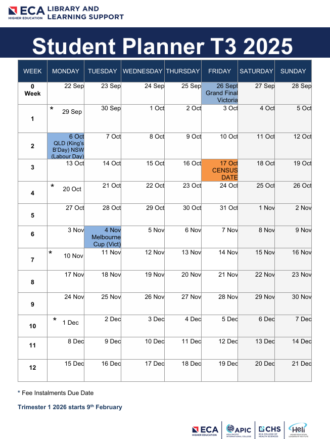Use our trimester planner to help organise your academic work throughout the term. It will help you get a visual overview of course work, assignments and exams so you can prioritise your time and maintain a balanced schedule throughout the trimester.