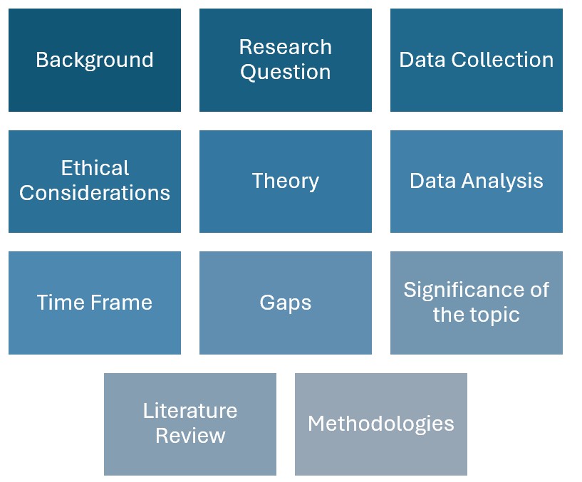 Typically, a research proposal includes an introduction or problem statement that outlines the focus of the study, a clear research question, a rationale explaining the topic and its significance, a literature review identifying gaps in the current literature and a detailed methodology describing the approach and tools to be used.