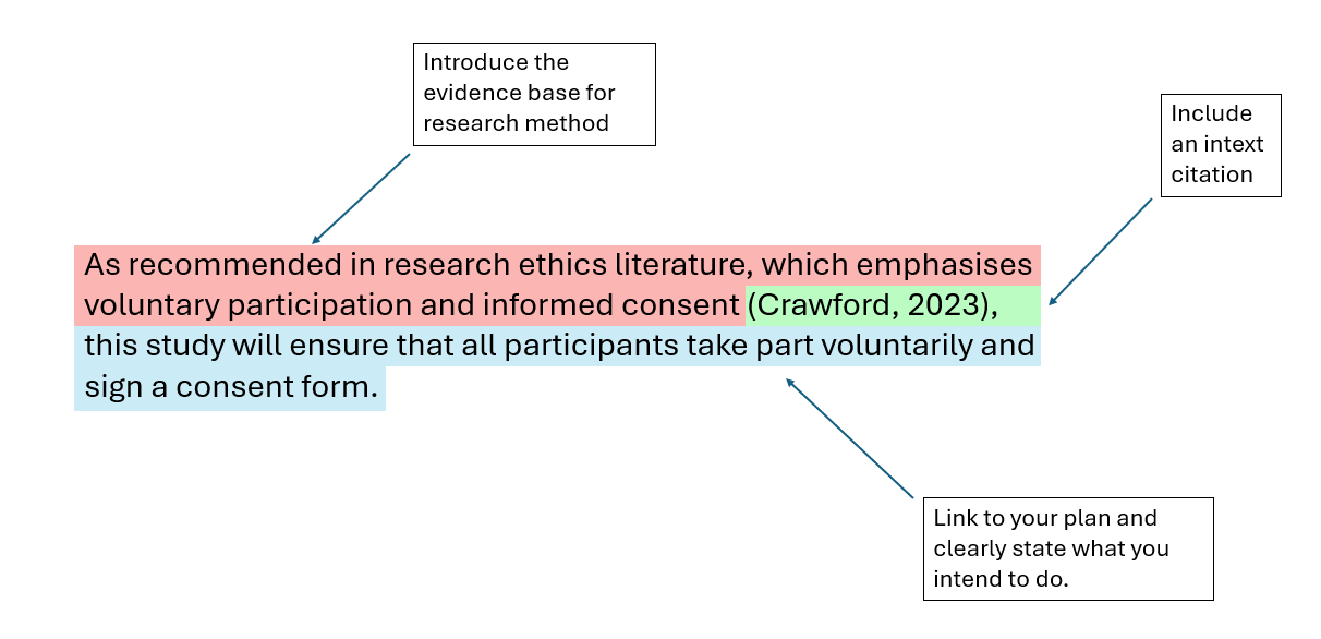 When planning a research project, it is important to show that your choice of methods is supported by evidence. Using evidence from academic sources demonstrates that your approach is not only personal preference but is also trusted and tested in the field. This strengthens your research by linking your plan to best practices and recommendations from other scholars. It also helps readers understand why your method is appropriate for answering your research question. By integrating evidence into your explanation, you make your research design more credible, reliable, and academically sound.